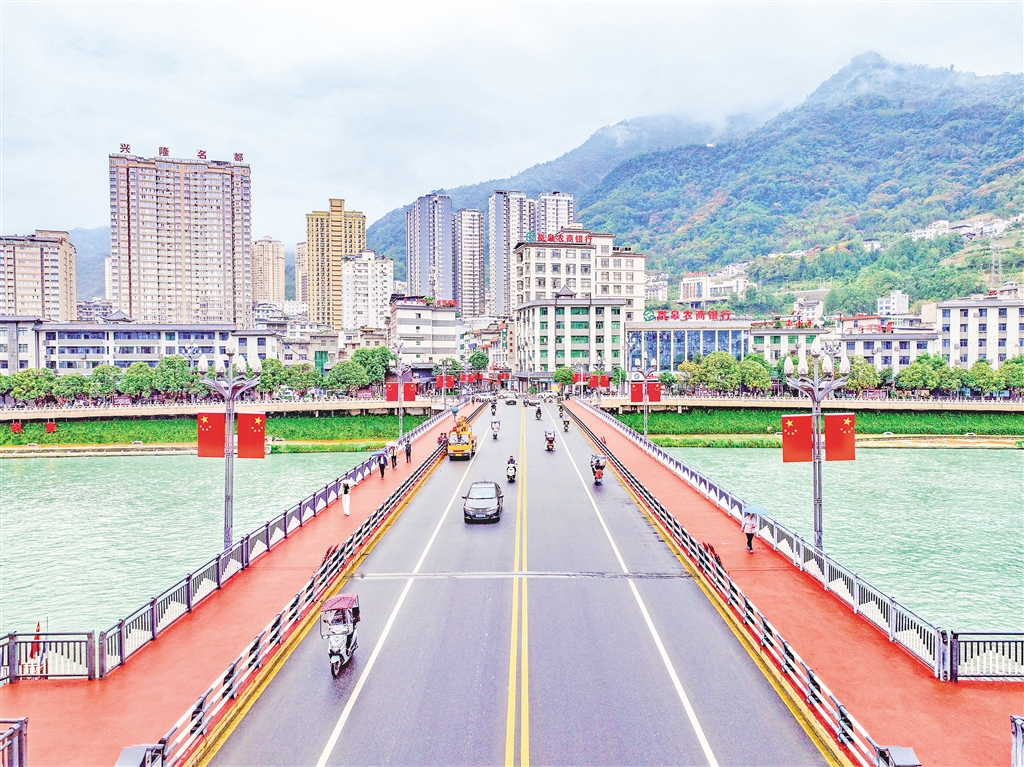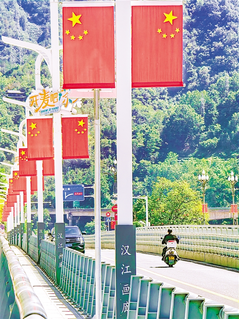 在嵐皋縣大橋兩側(cè),一面面整齊的五星紅旗迎風飄揚,喜迎國慶。 李王灝 攝wxP安康新聞網(wǎng)