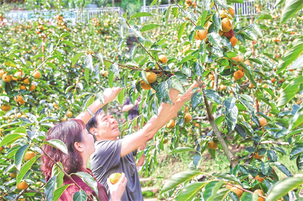 10月8日,游客在石泉縣城關(guān)鎮(zhèn)絲銀壩村脆甜柿子果園體驗(yàn)采摘樂趣。許兵 攝9KX安康新聞網(wǎng)