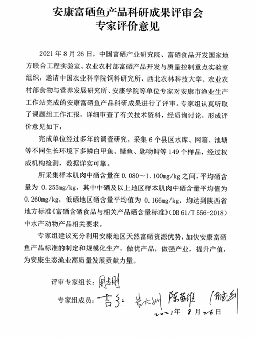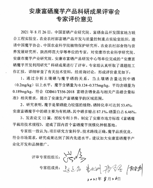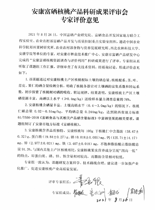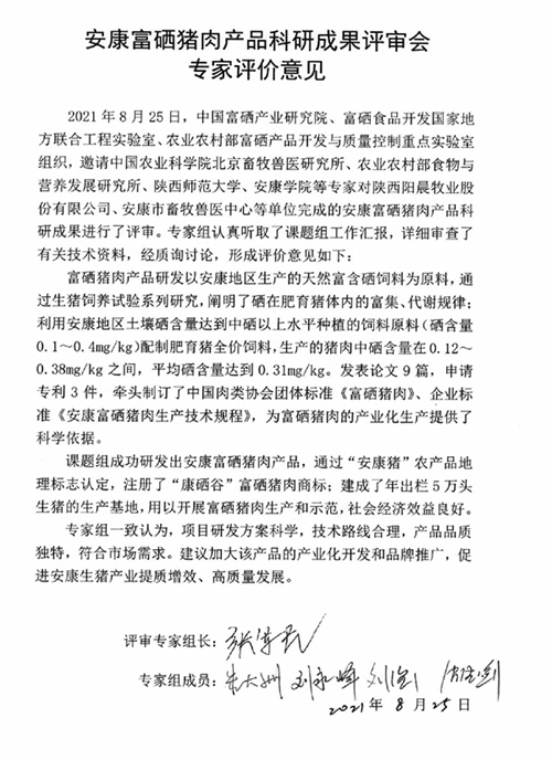 本次評審中,專家組認真聽取了課題組工作匯報,詳細審查了有關(guān)技術(shù)資料,經(jīng)質(zhì)詢討論后一致認為:四大富硒特色產(chǎn)業(yè)課題研發(fā)方案科學、技術(shù)路線合理,研究成果達到國內(nèi)先進水平,天然富硒是安康得天獨厚的資源優(yōu)勢,培育開發(fā)出的產(chǎn)品品質(zhì)優(yōu)良,符合市場需求。建議充分利用安康地區(qū)天然富硒資源優(yōu)勢,加快富硒特色產(chǎn)業(yè)標準的制定和規(guī);a(chǎn),做優(yōu)產(chǎn)品、做強產(chǎn)業(yè)、提升產(chǎn)值,加大該產(chǎn)品的產(chǎn)業(yè)化開發(fā)和品牌推廣力度,促進產(chǎn)業(yè)提質(zhì)增效。