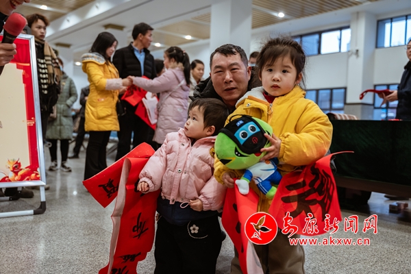 活動(dòng)中,“驛路安康”愛(ài)心服務(wù)熱線工作人員身著安安、康康、龍辰辰人偶服,穿梭在人群中,一邊分發(fā)福字、對(duì)聯(lián),一邊與旅客們互動(dòng)交流、合影留念。他們現(xiàn)場(chǎng)扶老攜幼、答疑解惑,熱情周到的服務(wù)溫暖了在場(chǎng)每一名旅客。