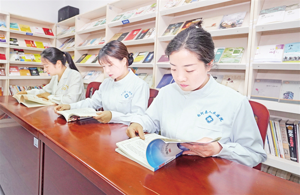 4月23日,白河縣人民醫(yī)院護士利用工作間隙在圖書角專注閱讀。(伍渭康 攝)  gBy安康新聞網(wǎng)