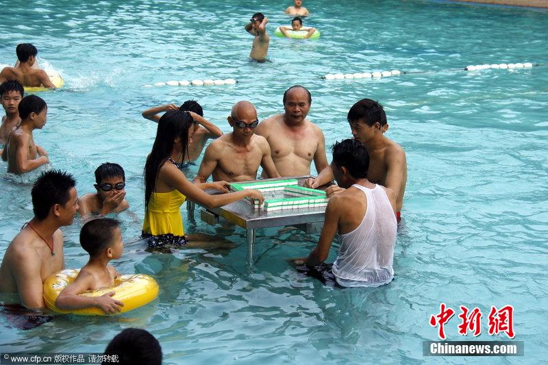 消暑娛樂兩不誤 游客泳池打麻將