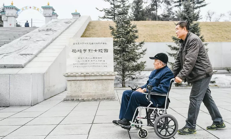 徐振明是吉林省通化市革命烈士陵園管理所首任所長(zhǎng),現(xiàn)年96歲。他先后參加過抗日戰(zhàn)爭(zhēng)、解放戰(zhàn)爭(zhēng),1950年參加抗美援朝戰(zhàn)爭(zhēng),曾榮立多次戰(zhàn)功。他退伍轉(zhuǎn)業(yè)到楊靖宇烈士陵園工作,父子兩代默默守護(hù)英雄陵墓60余年,身體力行保護(hù)革命遺跡,講述英雄故事,弘揚(yáng)革命精神。圖為徐振明(左)和兒子徐永軍來到楊靖宇烈士陵園。 新華社記者 王昊飛/攝