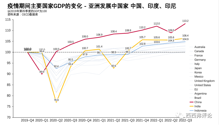 印度作為后起的發(fā)展中國(guó)家,在疫情前,經(jīng)濟(jì)增速已經(jīng)超過中國(guó)。但疫情這三年,中國(guó)擴(kuò)大了和印度之間的差距。中國(guó)2022年三季度,GDP是2019年四季度的113.2%,印度則只是106.4%。