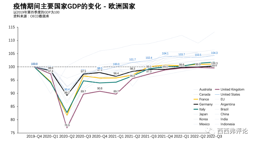 英法德意四個(gè)歐洲國(guó)家,從2019年四季度到2022年三季度,經(jīng)濟(jì)基本上原地踏步。