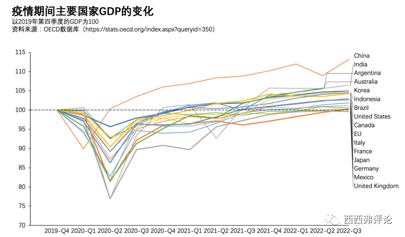 從GDP增長(zhǎng)的角度,疫情三年來,中國(guó)的經(jīng)濟(jì)增長(zhǎng)可以說在主要經(jīng)濟(jì)體中一枝獨(dú)秀。即使2022年經(jīng)濟(jì)增速大為放緩,但三年的總增速,仍然領(lǐng)先于上面的主要經(jīng)濟(jì)體。