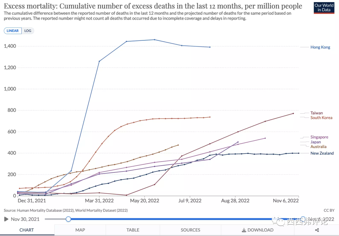 過去十二個(gè)月的累計(jì)超額死亡率,香港飆升到了萬分之十四,臺(tái)灣接近萬分之八,新加坡也超過了萬分之五。目前只有新西蘭,還在萬分之五以下。即使這樣,這幾個(gè)國(guó)家或地區(qū)在整個(gè)疫情期間的超額死亡率,仍然遠(yuǎn)遠(yuǎn)低于大部分歐美國(guó)家,他們?nèi)匀皇强挂叩膬?yōu)等生。