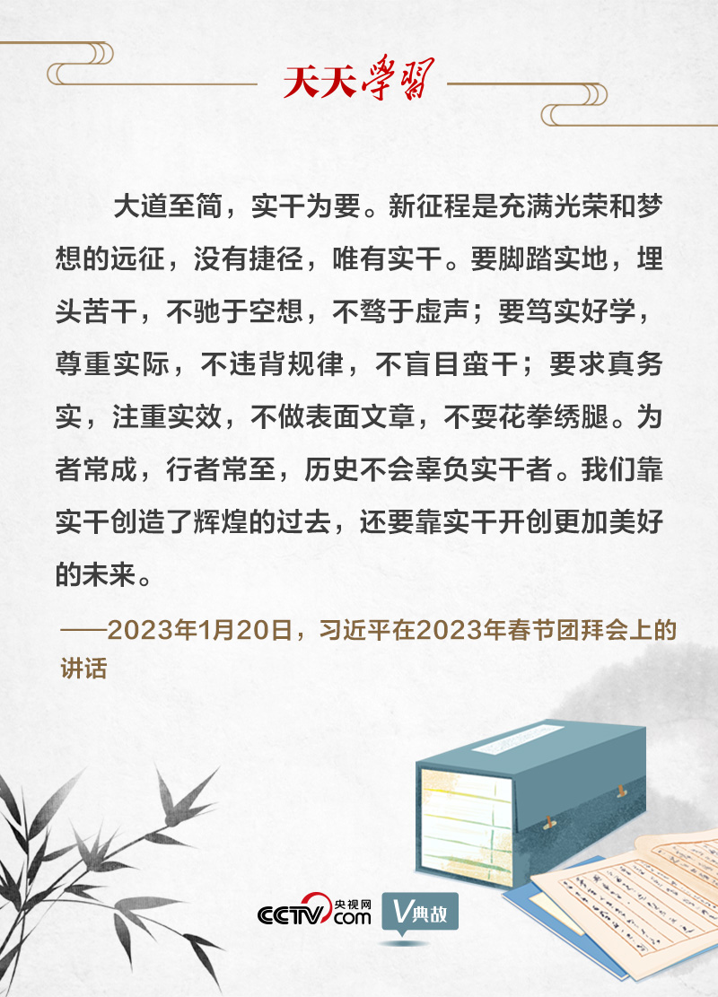 /天天學(xué)習(xí)/ 1月20日舉行的2023年春節(jié)團(tuán)拜會(huì)上,習(xí)近平總書(shū)記指出,新征程是充滿(mǎn)光榮和夢(mèng)想的遠(yuǎn)征,沒(méi)有捷徑,唯有實(shí)干。他引用古語(yǔ)“為者常成,行者常至”,發(fā)出新春號(hào)召:歷史不會(huì)辜負(fù)實(shí)干者。我們靠實(shí)干創(chuàng)造了輝煌的過(guò)去,還要靠實(shí)干開(kāi)創(chuàng)更加美好的未來(lái)。
