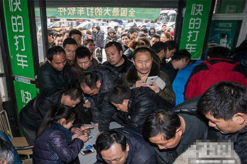 2014年2月19日,杭州“快的打車”服務(wù)點(diǎn),出租車司機(jī)們排隊安裝軟件。圖片來源:CFP視覺中國2014年2月19日,杭州,隨著“嘀嘀”、“快的”……