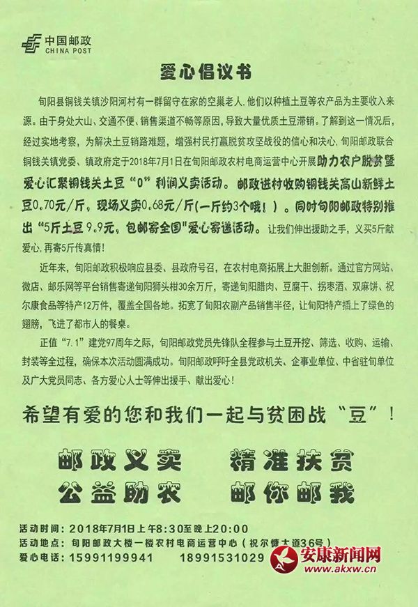 進(jìn)村高價(jià)回收、線下低價(jià)義賣:旬陽(yáng)郵政公司已經(jīng)與銅錢關(guān)鎮(zhèn)黨委、鎮(zhèn)政府對(duì)接聯(lián)合,赴沙陽(yáng)河村收購(gòu)高山新鮮土豆0.70元/斤,現(xiàn)場(chǎng)義賣0.68元/斤。對(duì),你沒(méi)有看錯(cuò),真正的高價(jià)收購(gòu),低價(jià)義賣,只為貧困戶的勞動(dòng)有尊嚴(yán)。定于2018年7月1日8點(diǎn)30分至晚上8點(diǎn),在旬陽(yáng)郵政大樓一樓農(nóng)村電商運(yùn)營(yíng)中心開(kāi)展“助力農(nóng)戶脫貧暨愛(ài)心匯聚銅錢關(guān)土豆義賣活動(dòng)”。