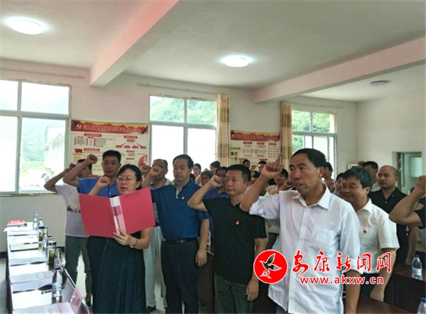 “我志愿加入中國共產(chǎn)黨,擁護(hù)黨的綱領(lǐng),遵守黨的章程……”7月17日,在老莊溝村二樓會議室里,來自市中心血站的20多名黨員干部與老莊溝村全體黨員統(tǒng)一佩戴黨徽,整齊列隊,舉起右手,在黨旗下莊嚴(yán)宣誓,重溫入黨誓詞。