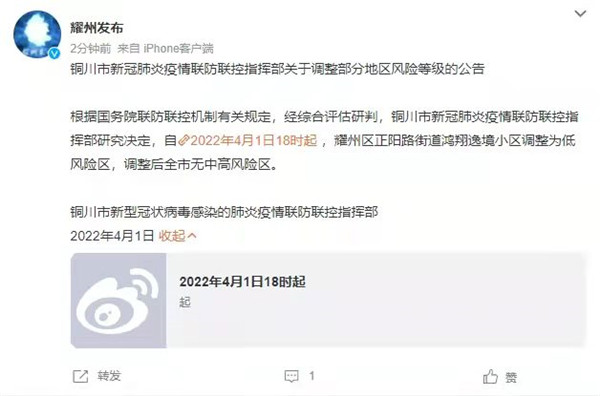 根據國務院聯(lián)防聯(lián)控機制有關規(guī)定,經綜合評估研判,銅川市新冠肺炎疫情聯(lián)防聯(lián)控指揮部研究決定,自2022年4月1日18時起 ,耀州區(qū)正陽路街道鴻翔逸境小區(qū)調整為低風險區(qū),調整后全市無中高風險區(qū)。