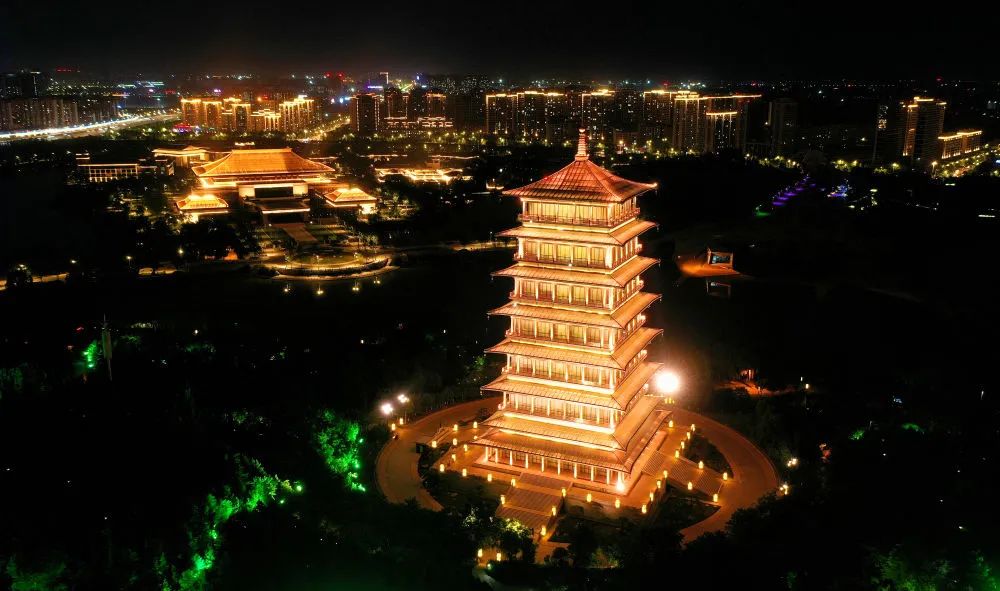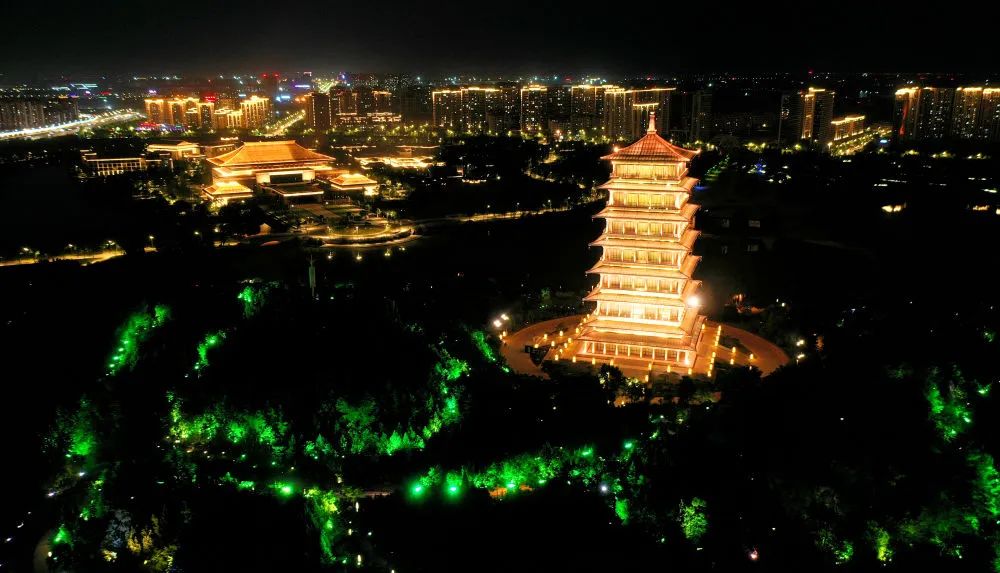 ↑西安曲江南湖夜景(4月19日攝,無(wú)人機(jī)照片)。新華社記者 劉瀟 攝