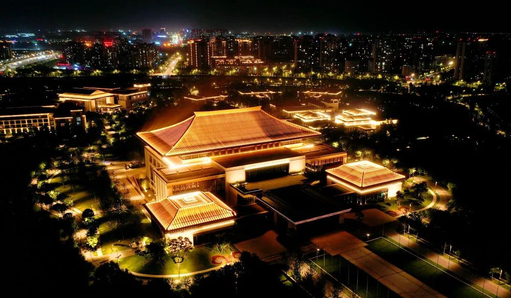 ↑位于西安浐灞生態(tài)區(qū)的西安國(guó)際會(huì)議中心(5月1日攝,無(wú)人機(jī)照片)。新華社記者 劉瀟 攝