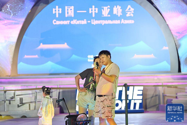 ↑5月16日,游客在西安市北大街上與中國-中亞峰會主題裝置合影。新華社記者 李一博 攝
