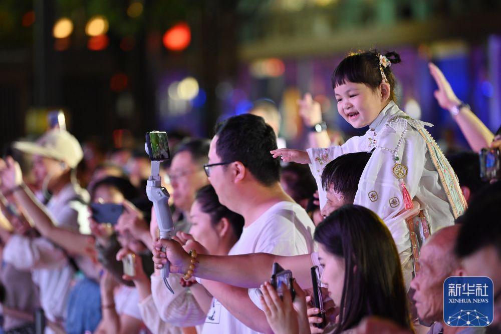 ↑5月15日,在西安大唐不夜城,身著古裝的小朋友騎在父親的肩上參與互動演出。新華社記者 宋為偉 攝