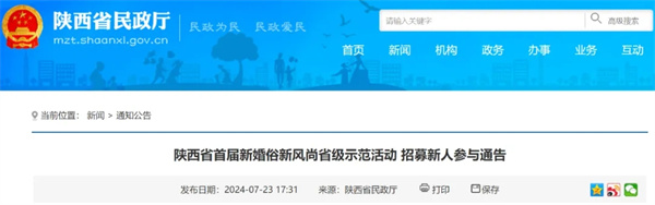 今年的8月10日,是中國(guó)傳統(tǒng)的七夕佳節(jié),為大力推進(jìn)婚姻領(lǐng)域移風(fēng)易俗,引導(dǎo)新人樹立文明、健康、理性的婚戀觀,陜西省民政廳等4部門計(jì)劃舉辦“福彩牽緣 愛(ài)在七夕”陜西省首屆新婚俗新風(fēng)尚省級(jí)示范活動(dòng),現(xiàn)面向全省招募新人。