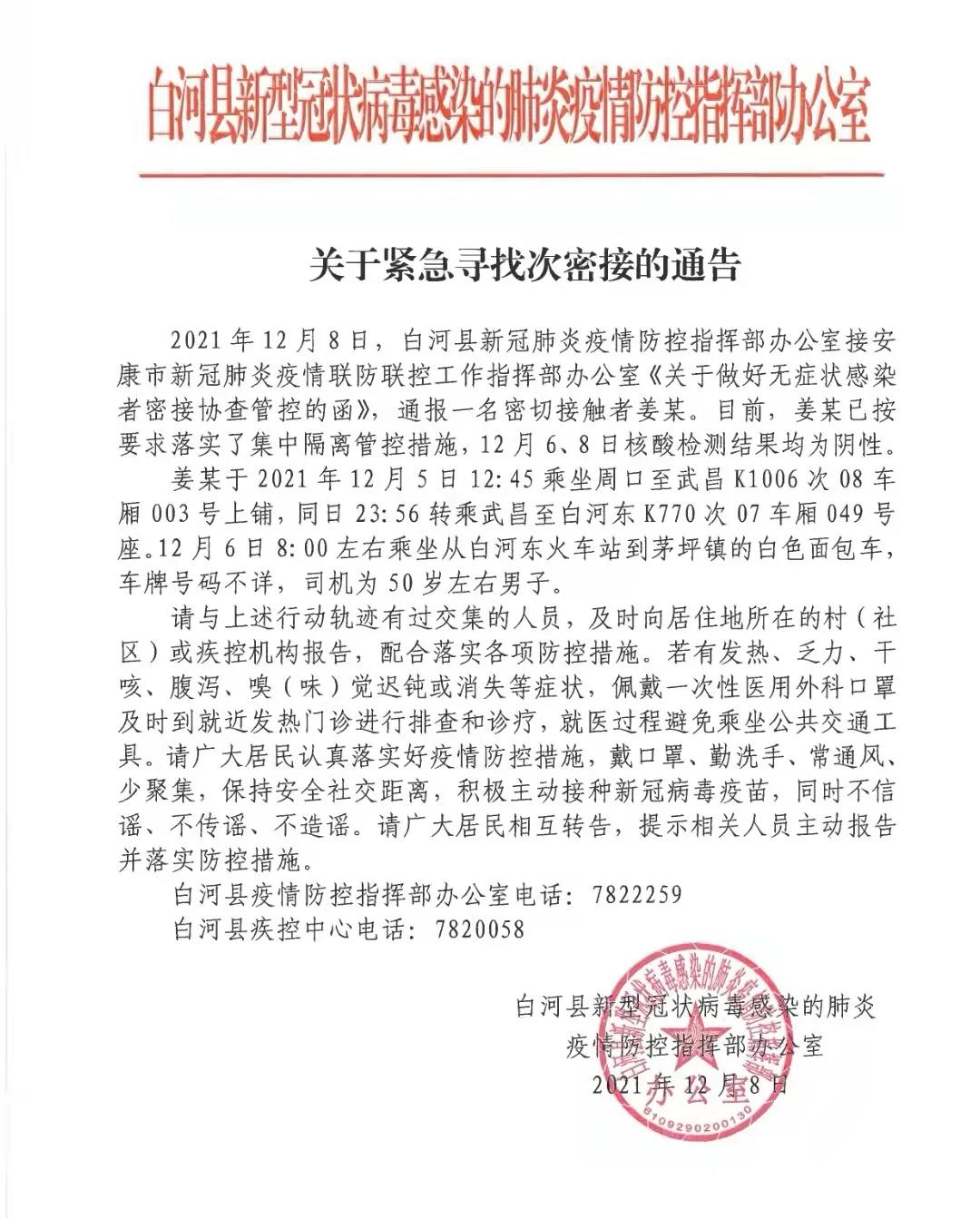 2021年12月8日,白河縣新冠肺炎疫情防控指揮部辦公室接安康市新冠肺炎疫情聯(lián)防聯(lián)控工作指揮部辦公室《關(guān)于做好無癥狀感染者密接協(xié)查管控的函》,通報一名密切接觸者姜某。目前,姜某已按要求落實了集中隔離管控措施,12月6、8日核酸檢測結(jié)果均為陰性。Qeh安康新聞網(wǎng)