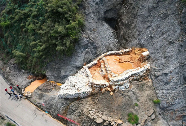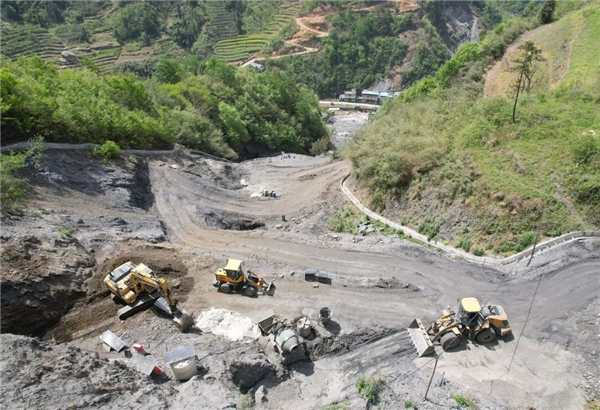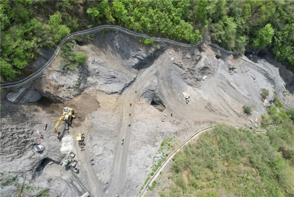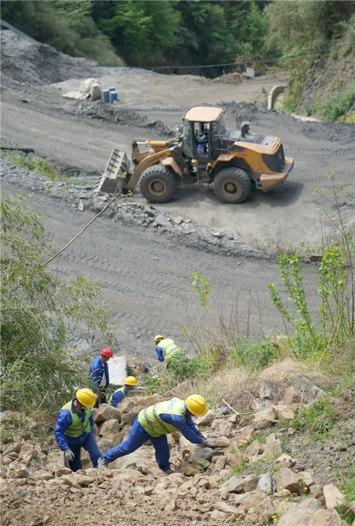 ↑4月9日,在白河縣卡子鎮(zhèn)鳳凰村一處廢棄硫鐵礦污染治理施工現(xiàn)場,工人在清理排洪渠。Sv2安康新聞網(wǎng)