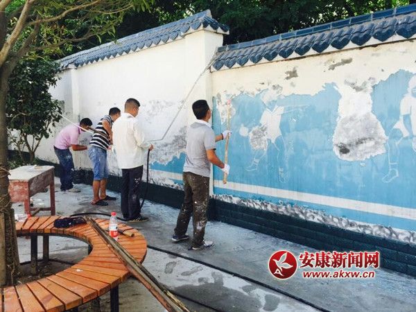 原來(lái)這是該校校園圍墻美化工程正在緊張的實(shí)施當(dāng)中,盡管酷暑難當(dāng),但學(xué)校領(lǐng)導(dǎo)依然堅(jiān)守崗位,工人師傅們更是揮汗如雨,認(rèn)真細(xì)心地做好每一道工序。該校近年來(lái)校園基礎(chǔ)設(shè)施建設(shè)發(fā)生了顯著變化,特別是總面積達(dá)12畝的塑膠操場(chǎng)建成后,更是讓原本清新整潔的校園新增了一道亮麗的風(fēng)景線。讓人感到美中不足的是原有500余米的圍墻墻面有些斑駁陳舊,學(xué)校積極爭(zhēng)取項(xiàng)目資金,并于7月4日正式開(kāi)始對(duì)圍墻進(jìn)行“美化”,秋季開(kāi)學(xué)之際,重返校園的師生將會(huì)看到一扇扇嶄新的、充滿人文氣息的文化宣傳墻。