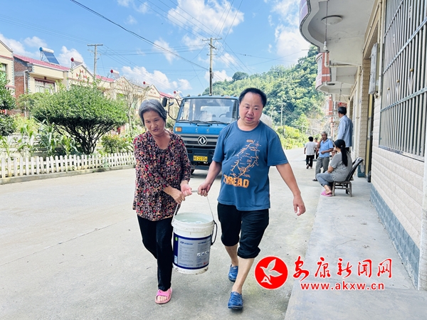 7月21日,再見到張世軻時(shí),他正忙著給村里的群眾送水,受強(qiáng)降雨影響,該村的供水工程管網(wǎng)和設(shè)施沖毀受損,鎮(zhèn)上組織了送水車解決村民用水問題。對于行動(dòng)不便的群眾,張世軻主動(dòng)幫助接水,并送水到家。
