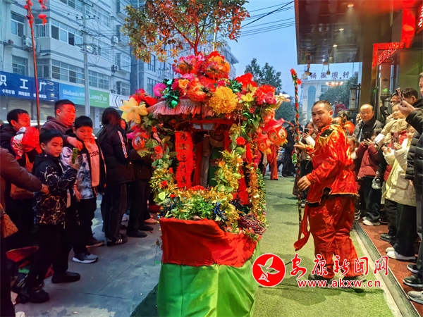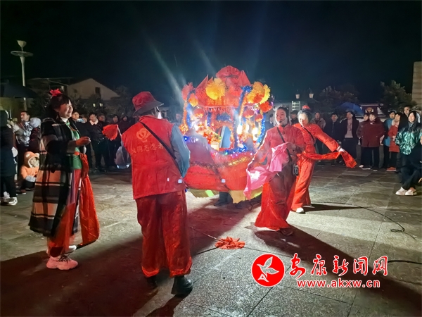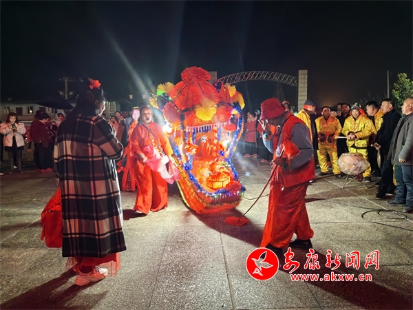 在位于漢陰縣平梁鎮(zhèn)的興隆佳苑社區(qū),春節(jié)期間,小區(qū)里處處洋溢著節(jié)日氛圍。夜幕降臨,社區(qū)廣場(chǎng)響起陣陣鑼鼓聲,;ù硌菡介_始。只見表演者雙手提船、配合默契,船體隨著“波浪”旋轉(zhuǎn)、顛簸,身穿喜慶艷麗的服裝、頭戴五彩頭飾的表演人員個(gè)個(gè)精神抖擻,一邊前行,一邊唱著漢陰本地的花鼓戲,祈求來年風(fēng)調(diào)雨順、福壽安康。翻飛的彩扇、華麗的彩船,精心編排、詼諧幽默的表演,為社區(qū)群眾呈現(xiàn)了一場(chǎng)精彩的視覺盛宴。