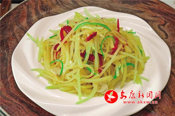 酸辣土豆絲:使用土豆、辣椒、白醋、蔥、姜等制作而成的菜肴,是深受嵐皋老百姓喜愛的一道家常菜,也是嵐皋人餐桌上最常見的家常菜,其主料土豆性平和味,有改善腸胃功能、預(yù)防高血壓的功效。