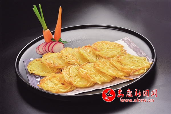 土豆絲餅:用嵐皋當(dāng)?shù)氐耐炼骨薪z,混入面糊,再用油煎炸出鍋,色澤金黃,清香酥脆,回味無窮。