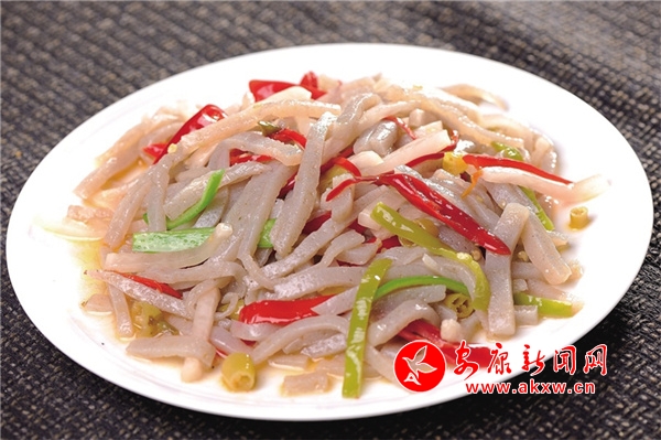 酸辣魔芋:是嵐皋特色名菜,也是當(dāng)?shù)胤沁z項(xiàng)目之一。以秋收后鮮魔芋漿汁為原料,加入堿水煮制,冷固后呈豆腐形狀,切塊后與當(dāng)?shù)嘏莶艘黄鸫蠡鸱炊伞Dв笾械?ldquo;堿”和泡菜中的“酸”完美結(jié)合,具有保護(hù)腸胃、排毒養(yǎng)顏、減肥瘦身的功效,同時還能降血糖、降血脂、降血壓。嵐皋民諺“要見好公婆,多吃鬼腦殼”,說的是姑娘吃了魔芋豆腐,瘦體健身、容光煥發(fā),能得到公婆的好感,F(xiàn)代醫(yī)學(xué)認(rèn)為,魔芋豆腐中含量最大的葡萄甘露聚糖,具有強(qiáng)大的膨脹力,超過任何一種植物膠的黏韌度,既可填充胃腸,消除饑餓感,又因所含熱量微乎其微,故能控制體重、減肥健美。此外,魔芋豆腐既能開胃化食,又能清除腸道垃圾,有防癌抗癌的神奇魔力,享有“防癌魔衣”“神奇食品”的美譽(yù)。
