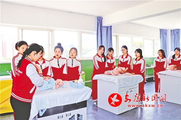 幼兒保育專業(yè)學(xué)生在課堂上展示幼兒護(hù)理技能。5KA安康新聞網(wǎng)