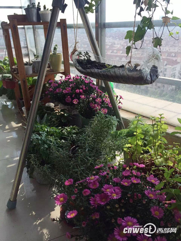 OO在陽(yáng)臺(tái)上種了不少花花草草和蔬菜。