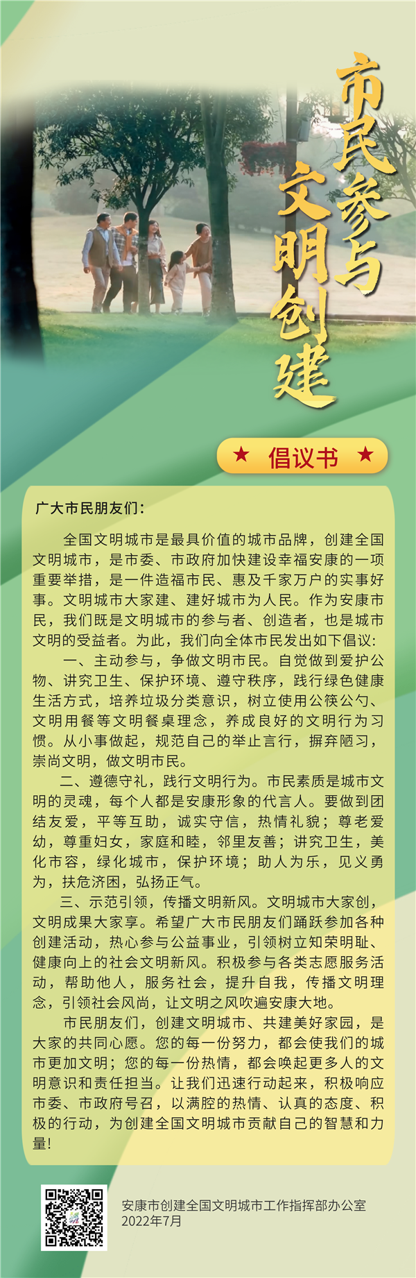 全國(guó)文明城市是最具價(jià)值的城市品牌,創(chuàng)建全國(guó)文明城市,是市委、市政府加快建設(shè)幸福安康的一項(xiàng)重要舉措,是一件造福市民、惠及千家萬(wàn)戶(hù)的實(shí)事好事。文明城市大家建、建好城市為人民。作為安康市民,我們既是文明城市的參與者、創(chuàng)造者,也是城市文明的受益者。為此,我們向全體市民發(fā)出如下倡議: