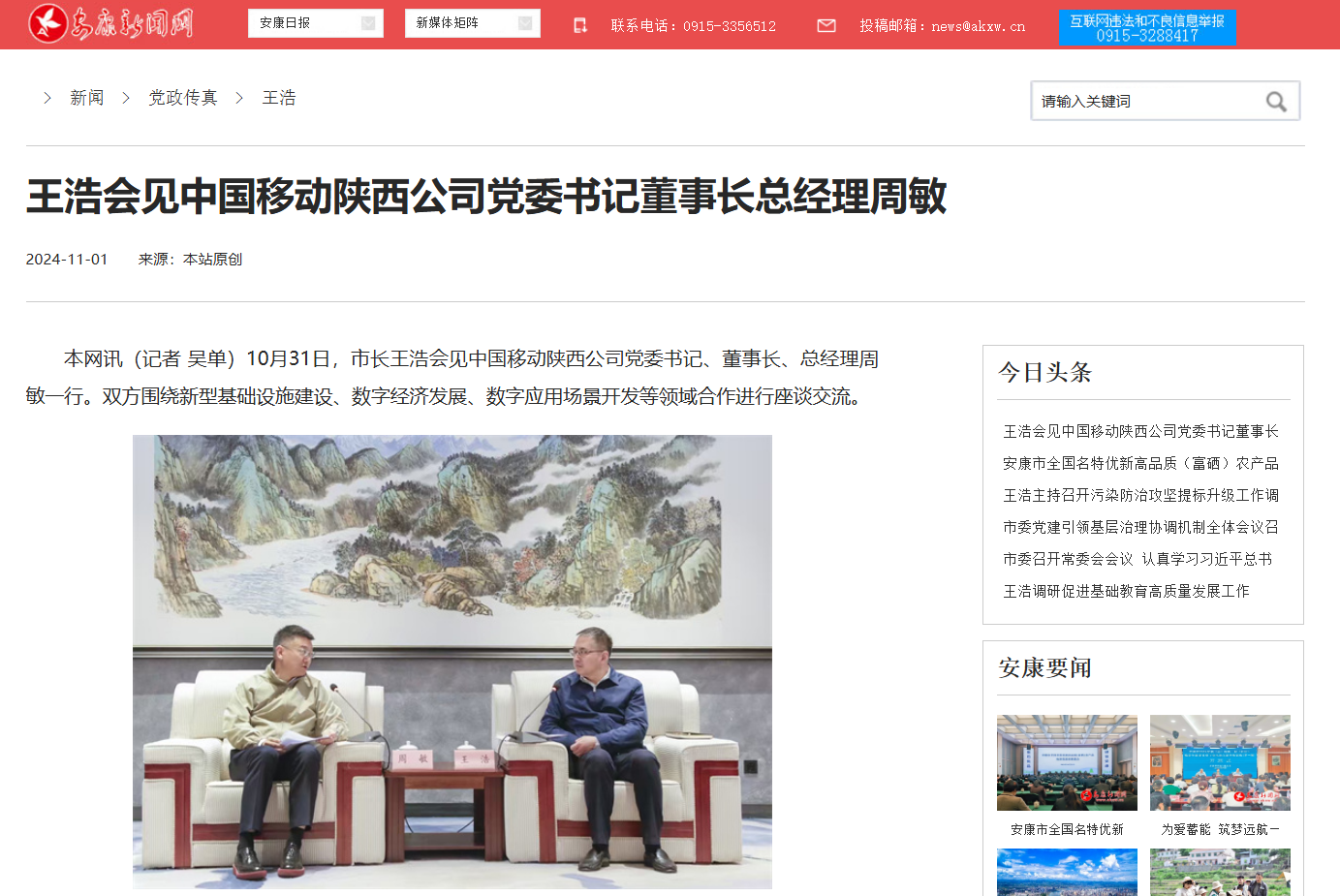 《王浩會見中國移動陜西公司黨委書記董事長總經(jīng)理周敏》(2024-11-01發(fā)布)x9P安康新聞網(wǎng)