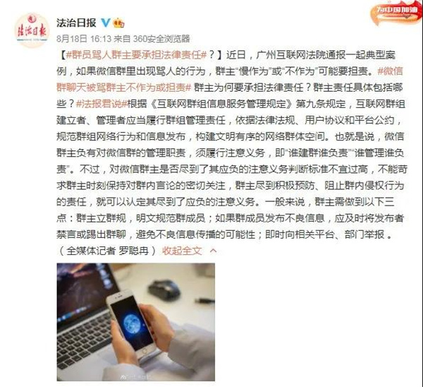 日前,廣州互聯(lián)網(wǎng)法院通報一起典型案例,如果微信群里出現(xiàn)罵人的行為,群主“慢作為”或“不作為”可能要擔責。