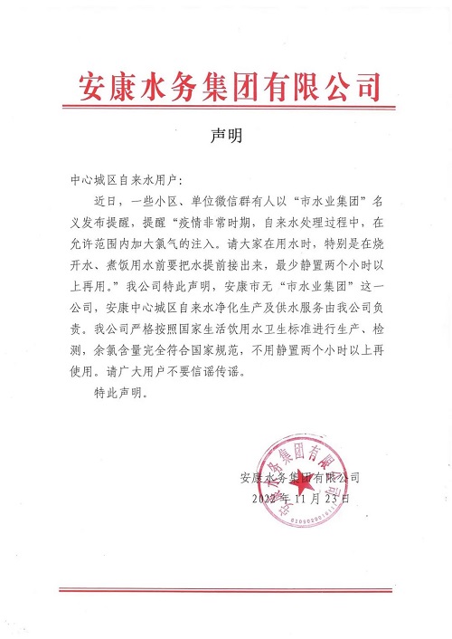 近日,一些小區(qū)、單位微信群有人以“市水業(yè)集團(tuán)”名義發(fā)布提醒,提醒“疫情非常時(shí)期,自來(lái)水處理過(guò)程中,在允許范圍內(nèi)加大氯氣的注入。請(qǐng)大家在用水時(shí),特別是在燒開(kāi)水、煮飯用水前要把水提前接出來(lái),最少靜置兩個(gè)小時(shí)以上再用。”我公司特此聲明,安康市無(wú)“市水業(yè)集團(tuán)”這一公司,安康中心城區(qū)自來(lái)水凈化生產(chǎn)及供水服務(wù)由我公司負(fù)責(zé)。我公司嚴(yán)格按照國(guó)家生活飲用水衛(wèi)生標(biāo)準(zhǔn)進(jìn)行生產(chǎn)、檢測(cè),余氯含量完全符合國(guó)家規(guī)范,不用靜置兩個(gè)小時(shí)以上再使用。請(qǐng)廣大用戶不要信謠傳謠。