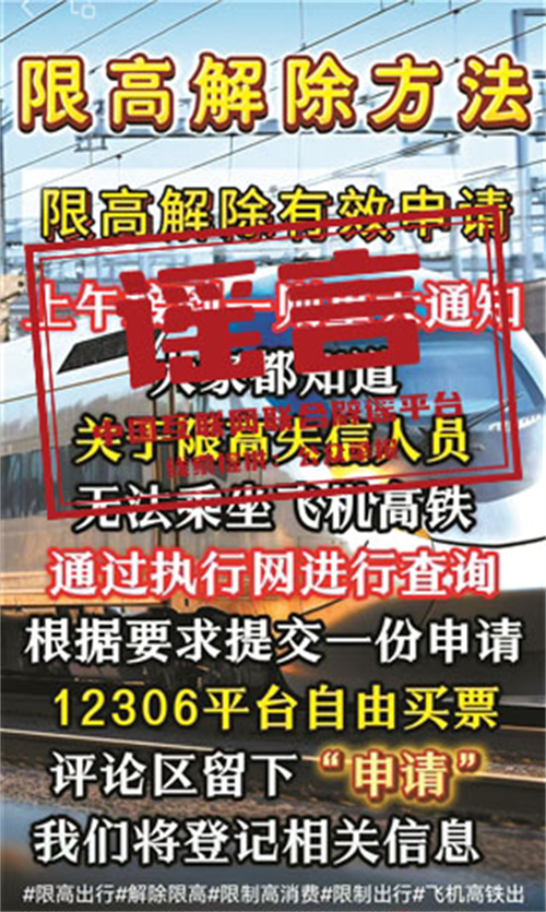 真相:近日,一些短視頻平臺(tái)頻現(xiàn)所謂“限高令新政”信息,宣稱(chēng)“有內(nèi)部途徑,被限制高消費(fèi)人員不用還款也能正常買(mǎi)機(jī)票、高鐵票”,引發(fā)關(guān)注。對(duì)此,最高人民法院執(zhí)行局相關(guān)負(fù)責(zé)人表示,關(guān)于“新政”一說(shuō)實(shí)屬謠言。各級(jí)人民法院從未出臺(tái)過(guò)解除限制消費(fèi)措施,或?yàn)椴粌斶債務(wù)的限高人員提供長(zhǎng)期“解限”的相關(guān)規(guī)定。網(wǎng)上關(guān)于對(duì)不履行生效法律文書(shū)確定義務(wù)的被執(zhí)行人解除限制消費(fèi)措施等內(nèi)容均為不實(shí)信息。(來(lái)源:北京青年報(bào))
