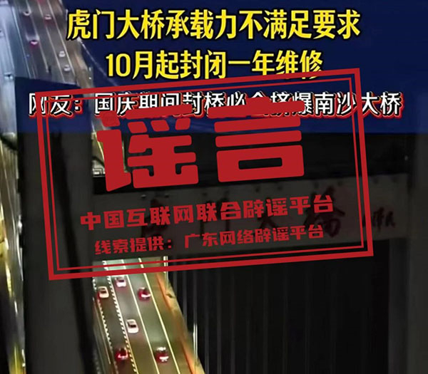 真相:近日,網(wǎng)絡(luò)上流傳“虎門大橋10月起封閉維修”的消息。經(jīng)東莞日?qǐng)?bào)記者核實(shí),該信息不準(zhǔn)確;㈤T大橋在國(guó)慶假期期間將正常通行且繼續(xù)實(shí)行免費(fèi)政策。9月29日,廣東虎門大橋有限公司明確表示:虎門大橋在2026年春節(jié)前不會(huì)采取全封或半封措施,具體封閉時(shí)間及方案,目前均未確定。據(jù)悉,此前東莞市發(fā)展和改革局曾發(fā)布過(guò)相關(guān)評(píng)估前的公示,其中提到預(yù)計(jì)開(kāi)工時(shí)間,但并非實(shí)際施工時(shí)間。(來(lái)源:“廣東省互聯(lián)網(wǎng)舉報(bào)中心”微信公眾號(hào)、東莞日?qǐng)?bào))