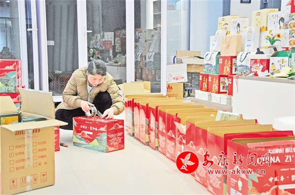 春節(jié)臨近,紫陽蒸盆子和年貨大禮包通過電商走進(jìn)了萬戶百姓家。目前已銷售紫陽蒸盆子4萬份,年貨大禮包1000余份。圖為工作人員在打包發(fā)貨。彭召伍 攝