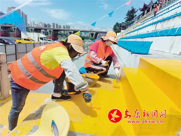 5月30日,工人們在第二十四屆安康漢江龍舟節(jié)主會(huì)場進(jìn)行地面第二輪刷漆。據(jù)市市政園林處現(xiàn)場負(fù)責(zé)人介紹,截至目前,已搭建隔離護(hù)欄3715米,建立安檢門及疏散通道18個(gè)、蛇形通道8個(gè),制作安裝導(dǎo)視牌10塊,對(duì)看臺(tái)區(qū)立面刷漆2629平方米,擦拭清洗并固定座椅3794個(gè)。錢運(yùn)立 攝8wd安康新聞網(wǎng)