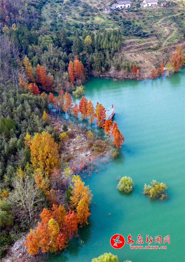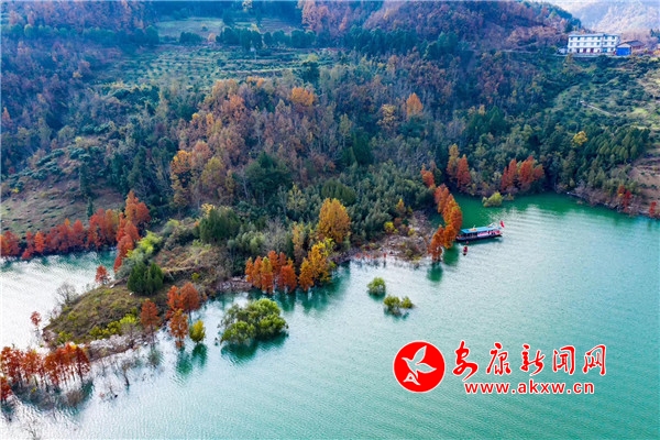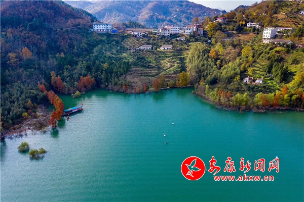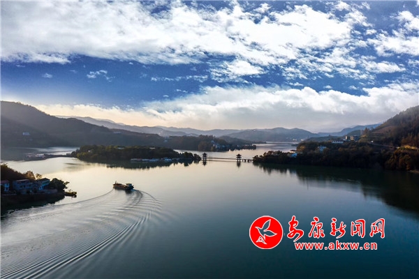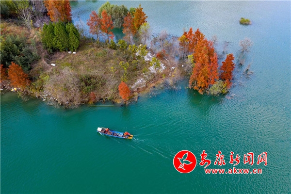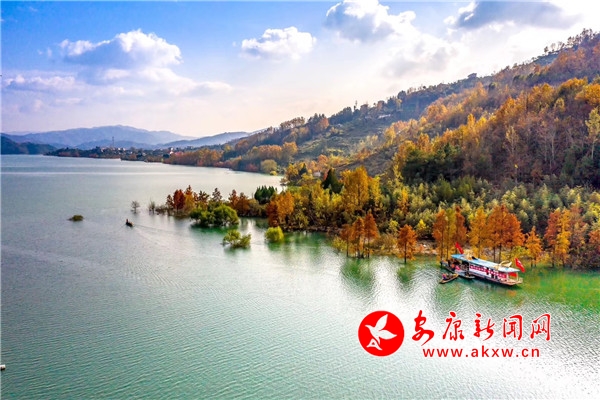 深秋時節(jié),蔚藍的天空一塵不染,晶瑩明澈,朵朵云霞映照在碧波如洗的瀛湖水間,分外絢麗。