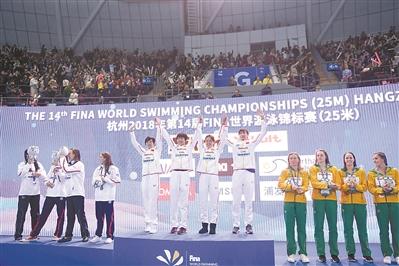 今晚,杭州2018年第14屆FINA世界游泳錦標(biāo)賽(25米)決出了7個(gè)項(xiàng)目的金牌,其中,李冰潔、楊浚瑄、張雨涵、王簡(jiǎn)嘉禾組成的中國(guó)女隊(duì)以7分34秒08的成績(jī)打破亞洲紀(jì)錄,力壓美國(guó)隊(duì)和澳大利亞隊(duì)奪得了女子4×200米自由泳接力的金牌,這是中國(guó)游泳隊(duì)在本屆短池世錦賽上的第3枚金牌,也是王簡(jiǎn)嘉禾個(gè)人第2枚金牌。