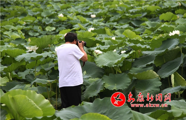 在荷塘間,游客們徜徉其中,賞花拍攝,成為雙乳鎮(zhèn)盛夏的一道亮麗風景。密密層層的碧綠荷葉滾動著晶瑩的水珠,一枝枝粉紅色、雪白色的荷花亭亭玉立,散發(fā)著淡淡的幽香。站在對面的山上極目遠眺,大片的荷花在陽光的照耀下顯得分外妖嬈。