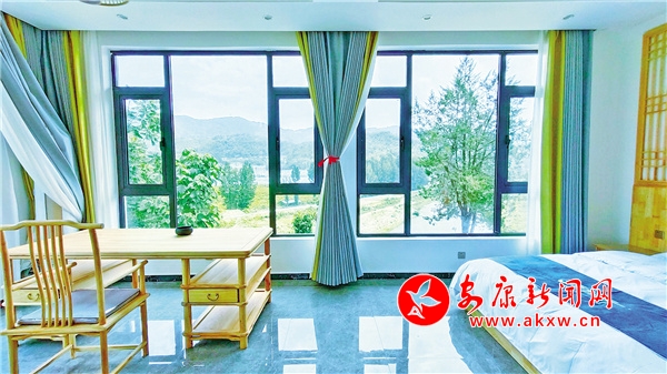 半山腰的獨(dú)棟別墅白墻黑瓦,飛檐峭壁,處處滲透著平淡質(zhì)樸的古典韻味;张山ㄖ骋星嗌剑娉瘝{谷,壩河水在谷間緩緩流淌。別墅里每一間都布置得精致高端,站在二樓落地窗前,觀連綿青山,賞花鳥飛禽,讓人陡然間心靜如水。