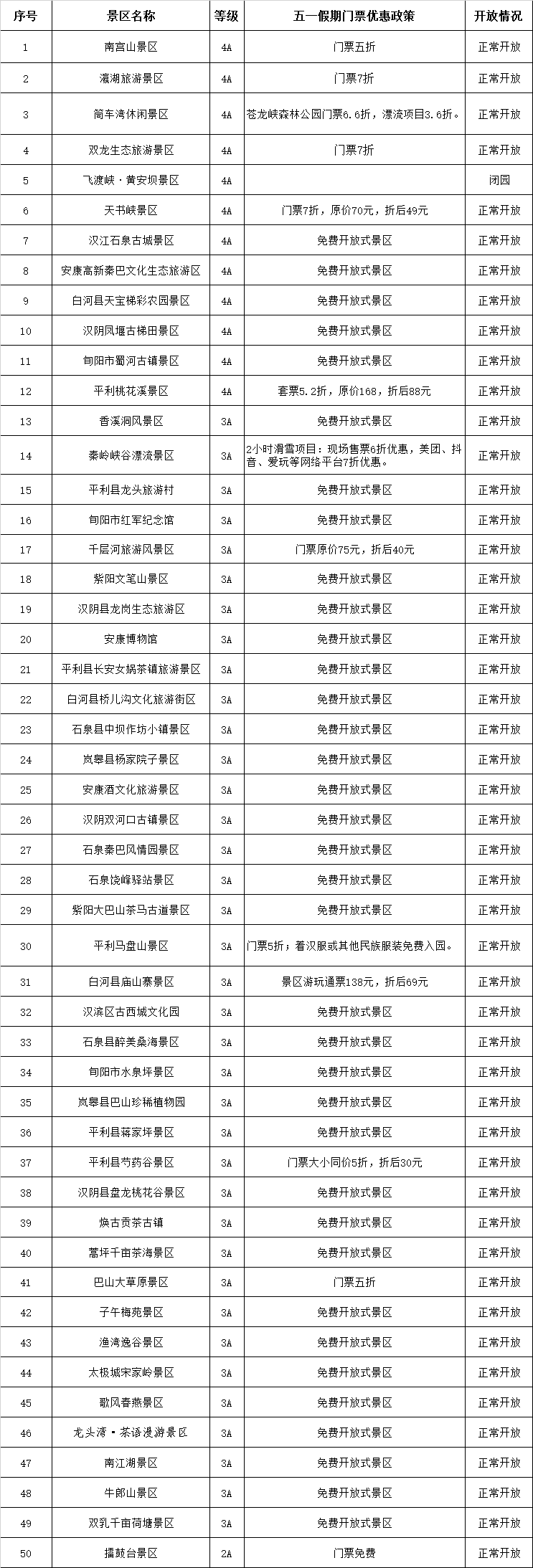 安康市2024年“五一”假日A級旅游景區(qū)門票優(yōu)惠及開放情況