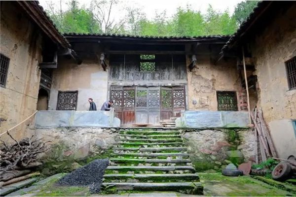 經(jīng)天井院上九步石梯到長(zhǎng)廊,此廊為石栓石欄。正面堂屋為六開(kāi)槅扇門,門窗為土木雕刻工藝,國(guó)文壽字,古銅錢、蝙蝠、冬瓜圈、梭子圈、卷草等工藝。此處為黃家紙廠議事之地,巧借地勢(shì)突出氣勢(shì),雖只兩層,卻與兩邊三層廂房等高,借助前面的大天井采光,構(gòu)成院中府第,顯然是吸取了湖廂府衙式建筑理念。從堂屋前的過(guò)道可通往東西兩側(cè)小天井,面向大門,西側(cè)小天井因地勢(shì)縮進(jìn)2米,但建有曬樓(陽(yáng)臺(tái)),雖然天井狹小,但天井里鑿內(nèi)池、留溝防、設(shè)路徑、安石碑,甚至連置盆栽種都應(yīng)有盡有,雖然時(shí)光侵蝕,破損嚴(yán)重,但遺跡清晰可辨,足見(jiàn)主人生活饒有情趣。